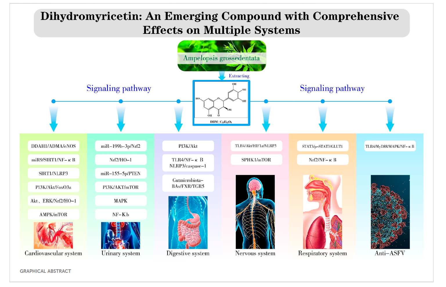 Managing diabetes mellitus (DM) and its long-term complications remains a major global health challenge. Dihydromyricetin (DHM), a natural flavonoid abundant in Ampelopsis grossedentata and Hovenia dulcis, has attracted increasing attention for its multi-target anti-diabetic properties. Growing evidence indicates that DHM improves glucose metabolism, alleviates oxidative stress and inflammation, regulates autophagy and cell death, and exerts beneficial effects in DM and a range of related complications, including diabetic nephropathy, cardiomyopathy, cognitive impairment, and wound healing impairment, and other related complications. Overall, this review provides an overview of preclinical research on DHM in DM and its main complications, emphasizing its therapeutic benefits and underlying molecular mechanisms.
