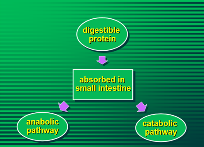 Digestibility of proteins, hydrolyzed in the digestive tract, thus releasing its constituent amino acids in the first 100 cm of the small intestine, where they are absorbed. Then those amino acids can follow either the anabolic or the catabolic pathway.