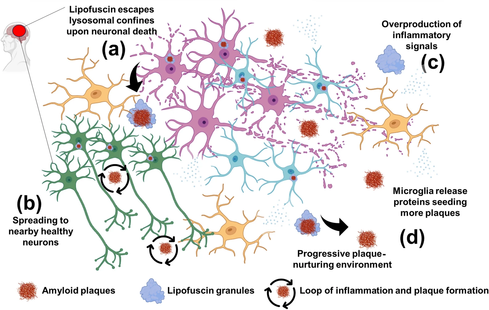 We examine the potential interplay between lipofuscin accumulation, lysosomal dysfunction, lipid peroxidation and amyloid-β pathology in AD. We explore how lipofuscin may influence amyloid-β aggregation, clearance, and toxicity and propose mechanisms by which lipofuscin modulates AD progression. Importantly, we summarize evidence demonstrating that lipofuscin is released extracellularly upon neuronal death, thus preparing a highly oxidized environment that results in toxicity and a cascade of events leading to plaque formation and amyloid-β pathology.