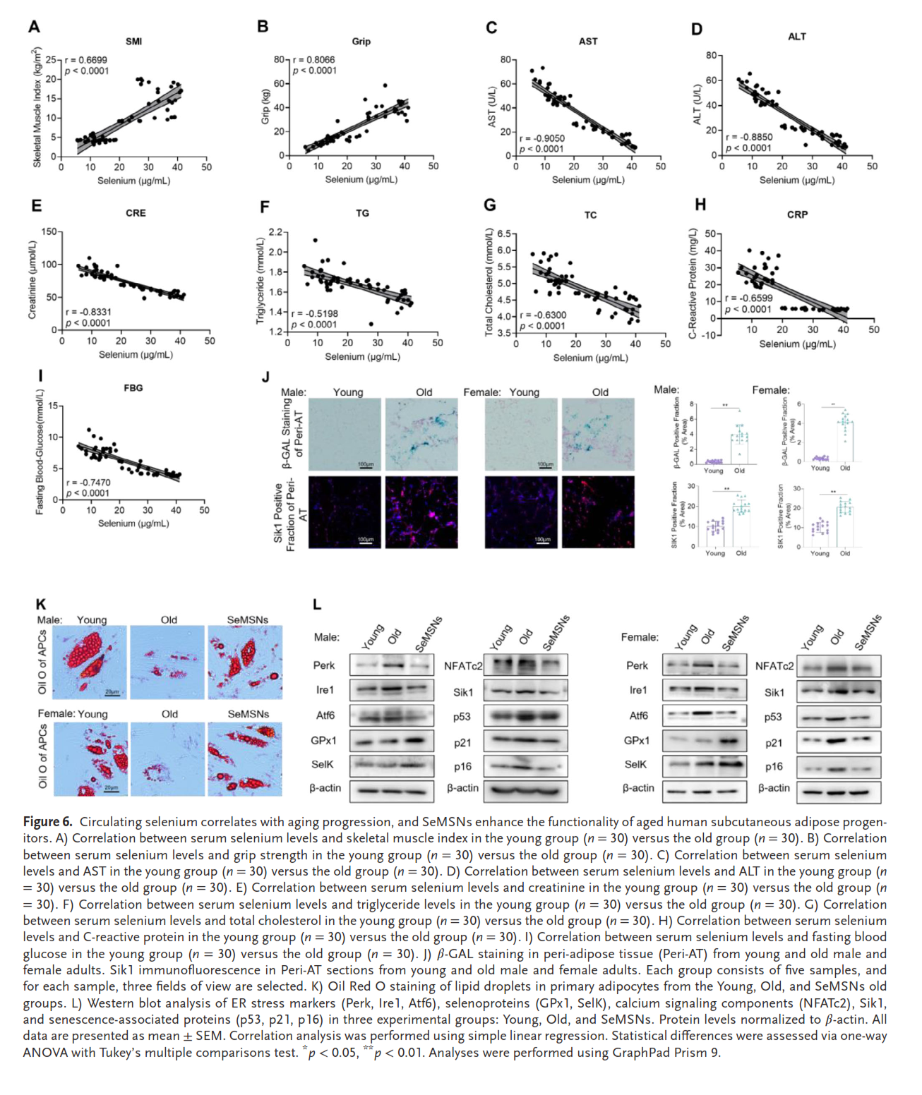Selenium supplementation has potential in treating aging-related disorders like neurodegenerative and cardiovascular diseases, but its use is limited by poor bioavailability, a narrow therapeutic window, and unclear mechanisms. To overcome this, redox-dual-responsive diselenide-bridged mesoporous silica nanoparticles (SeMSNs) are developed. SeMSNs effectively reduce oxidative stress and downregulate senescence markers (p16, p21), suppressing senescence in both naturally aged primary mouse embryonic fibroblasts (MEFs) and H2O2-induced HEK-293T cells. They show prolonged antioxidant effects (p < 0.05) and lower cytotoxicity (p < 0.01) than commercial selenomethionine. In aged mice, SeMSNs extend lifespan, reduce frailty, and improve age-related conditions, including muscle atrophy, renal dysfunction, cognitive decline, and hepatic steatosis, while restoring metabolic balance. They outperform conventional organically-bridged mesoporous silica nanoparticles (MSNs) and disulfide-bridged MSNs (SMSNs) (p < 0.01). Mechanistically, SeMSNs upregulate selenoproteins (GPx1, SelK), suppress endoplasmic reticulum (ER) stress-mediated calcium release, maintain calcium homeostasis, and inhibit NFATc2-driven Sik1 transcription, reducing p21/p16. Clinical data confirm an inverse correlation between selenium levels and aging biomarkers (p < 0.0001). SeMSNs also restore adipogenic differentiation in human adipose progenitor cells via calcium-NFATc2-Sik1 signaling. These results demonstrate the superiority of SeMSNs over traditional selenium forms, providing a nanotherapeutic strategy to combat multi-organ aging and promote healthy longevity.