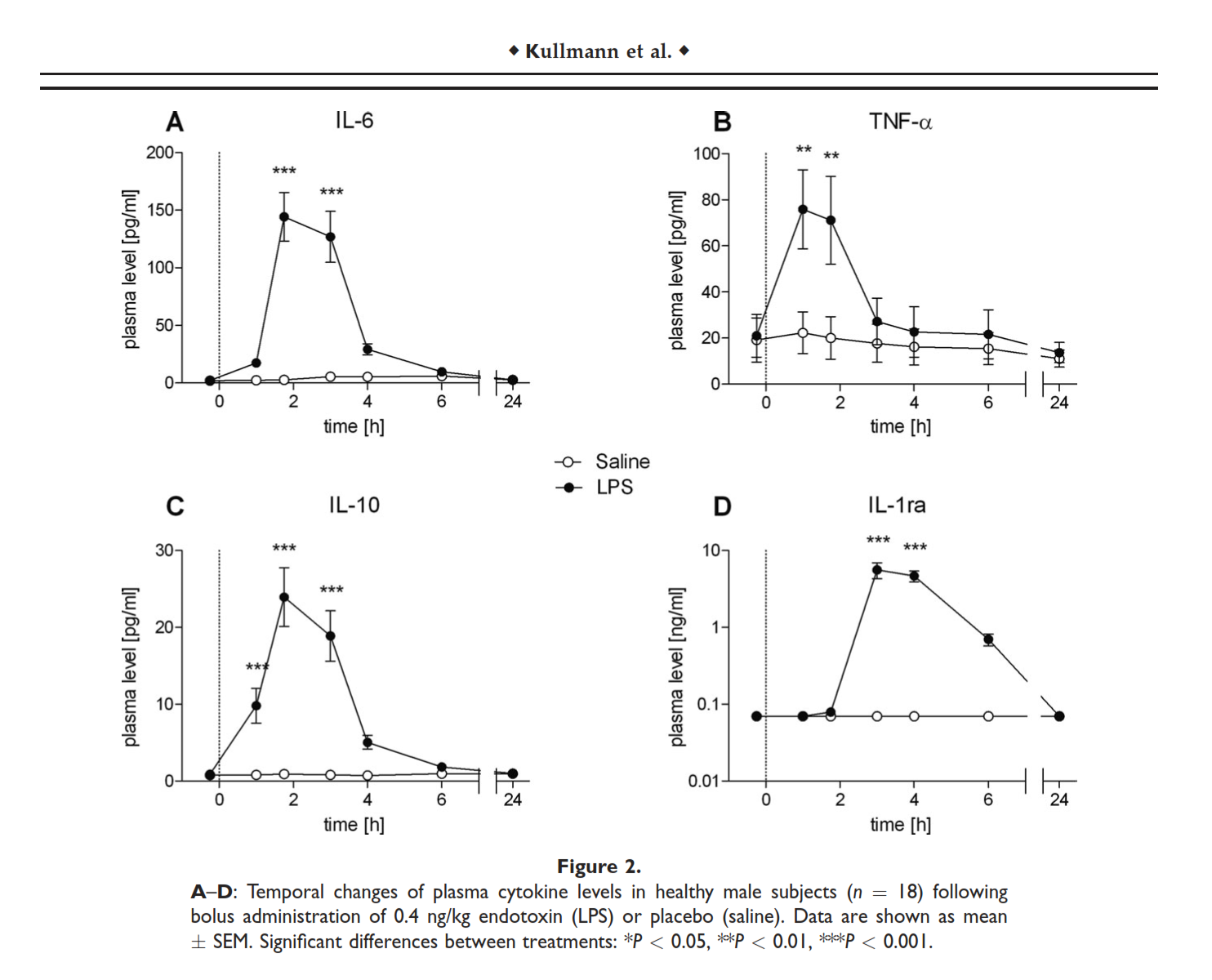 Experimental Human Endotoxemia (2013)Endotoxin administration induced pronounced transient increases in plasma levels of TNF-a, IL-1ra, IL-6, IL-10, and cortisol. Positive mood was decreased and state anxiety increased. In addition, activation of right inferior orbitofrontal cortex (OFC) in response to emotional visual stimuli was significantly increased in the LPS condition. Increased prefrontal activation during the presentation of emotional material may reflect enhanced cognitive regulation of emotions as an adaptive response during an acute inflammation. These findings may have implications for the putative role of inflammatory processes in the pathophysiology of depression.