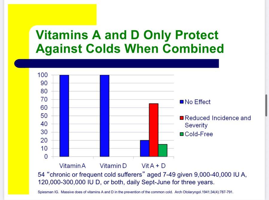 IG Spiesman showed in 1941 that vitamins A and D prevent colds when given together and do absolutely nothing to prevent colds when given alone.