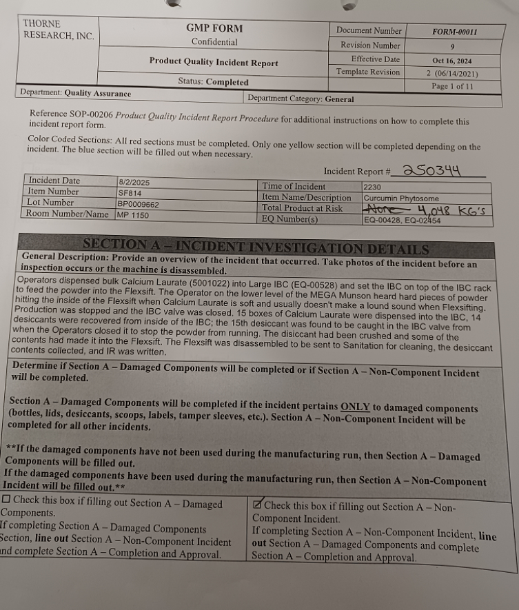 On 02/28/26 4chan user made thread on /fit/ board, claiming being a Thorne company employee and saying that supplement manufacturing process involves milling silica gel desiccants that come with raw materials to the final product, with photographic evidence.