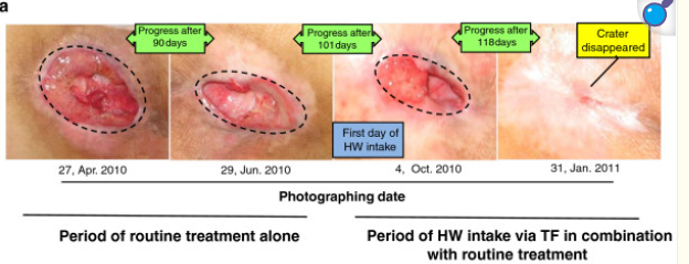 All patients received routine care treatments for PU in combination with HW intake via TF for 600 mL per day, in place of partial moisture replenishment. On the other hand, HW was prepared with a hydrogen-bubbling apparatus which produces HW with 0.8-1.3 ppm of dissolved hydrogen concentration
