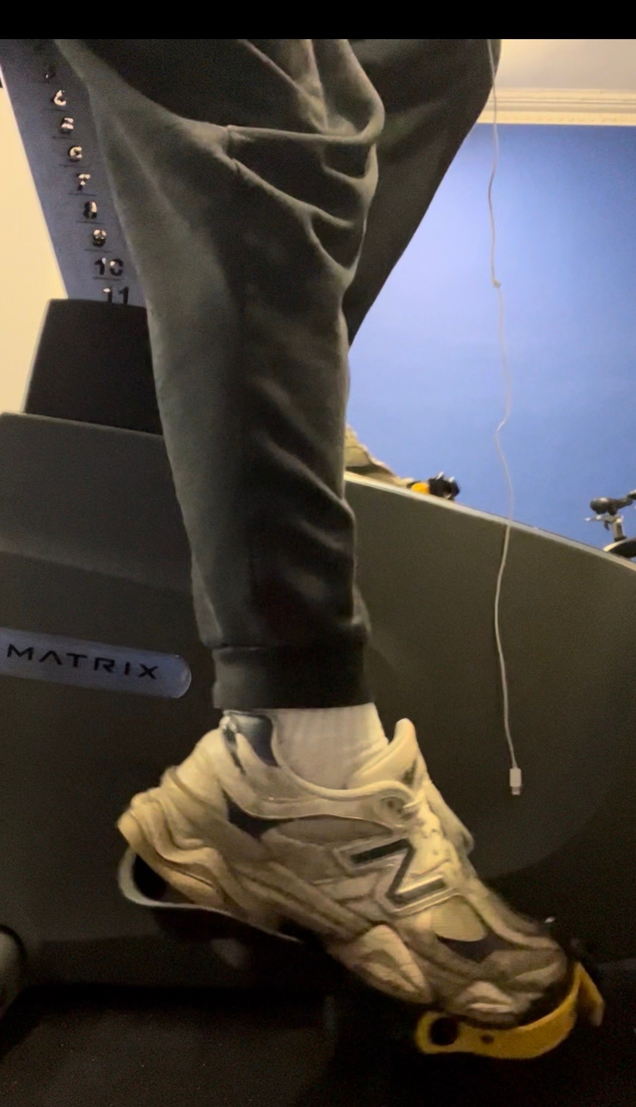 You want your heels to be raised signifcantly. I am lucky, and there is a Matrix bike with a plaform to put the heels of my shoe on. If this bike is not available, I would use height boosting insoles and socks with platforms built into them. I cannot explain why, but the effects on the knee joints are WAY different when you do this. After I am done with the session, my knee joints so much more fatigued and less sturdy (in a good way, not painfull AT ALL), relative to if my feet were flat.